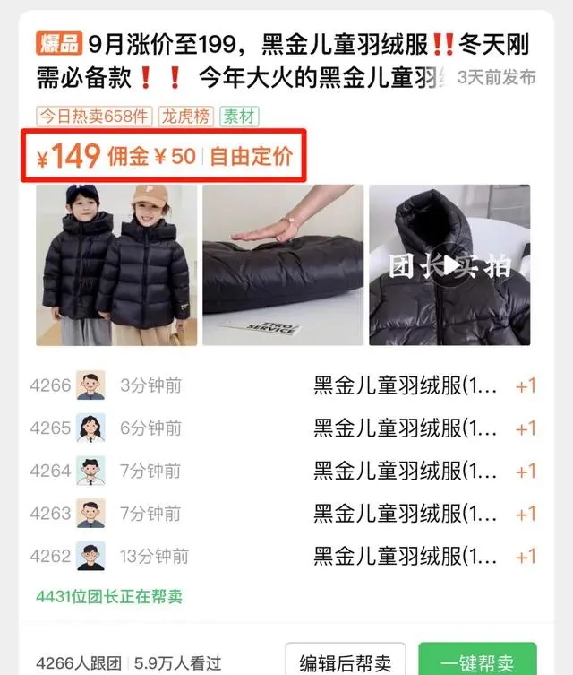 以羽絨服團為例,傭金50元,點擊一鍵幫賣后就能邀請好友參團,每賣出一件就能獲得50元的傭金。